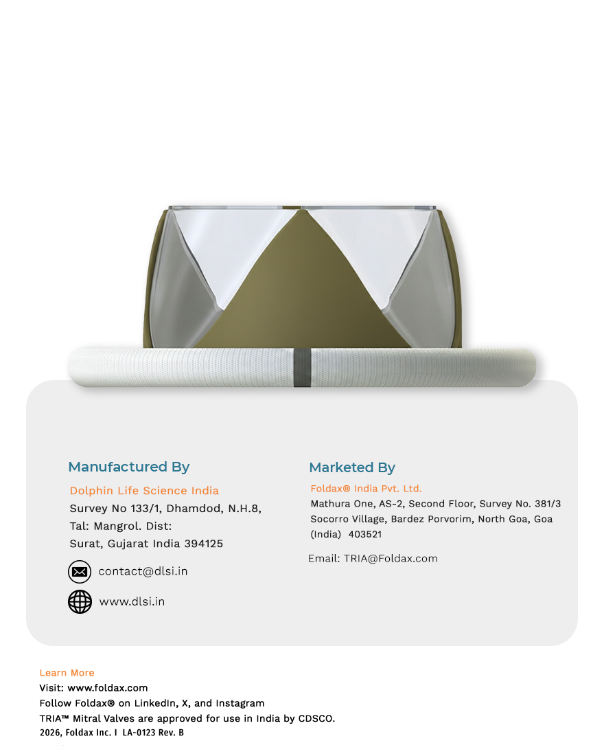 Dolphin Life Science India LLP is the legal manufacturer of the TRIA™ Mitral Valve in India. In partnership with Foldax Inc.®, Dolphin brings in-country expertise and advanced manufacturing capability to support the world’s first polymer surgical mitral valve made with LifePolymer™. This collaboration enables localized production that ensures precision, quality, and availability for Indian patients.
